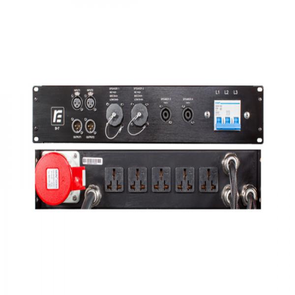 简要说明1、2U机箱高度设计; 2、配置了信号输入/输出接口×2、Neutrik四芯音箱插座×2、威浦S28-ZV七针芯插座×2、单相220V/16A万能电源输出插座×5,并配备三相380V/32A防水电源输入插头(带1米电源线)/输出插座,为相邻功放机柜提供供电; 3、为每一相电源输入配有1个空气开关; 4、适合四分频四驱动以内的扩声系统使用;